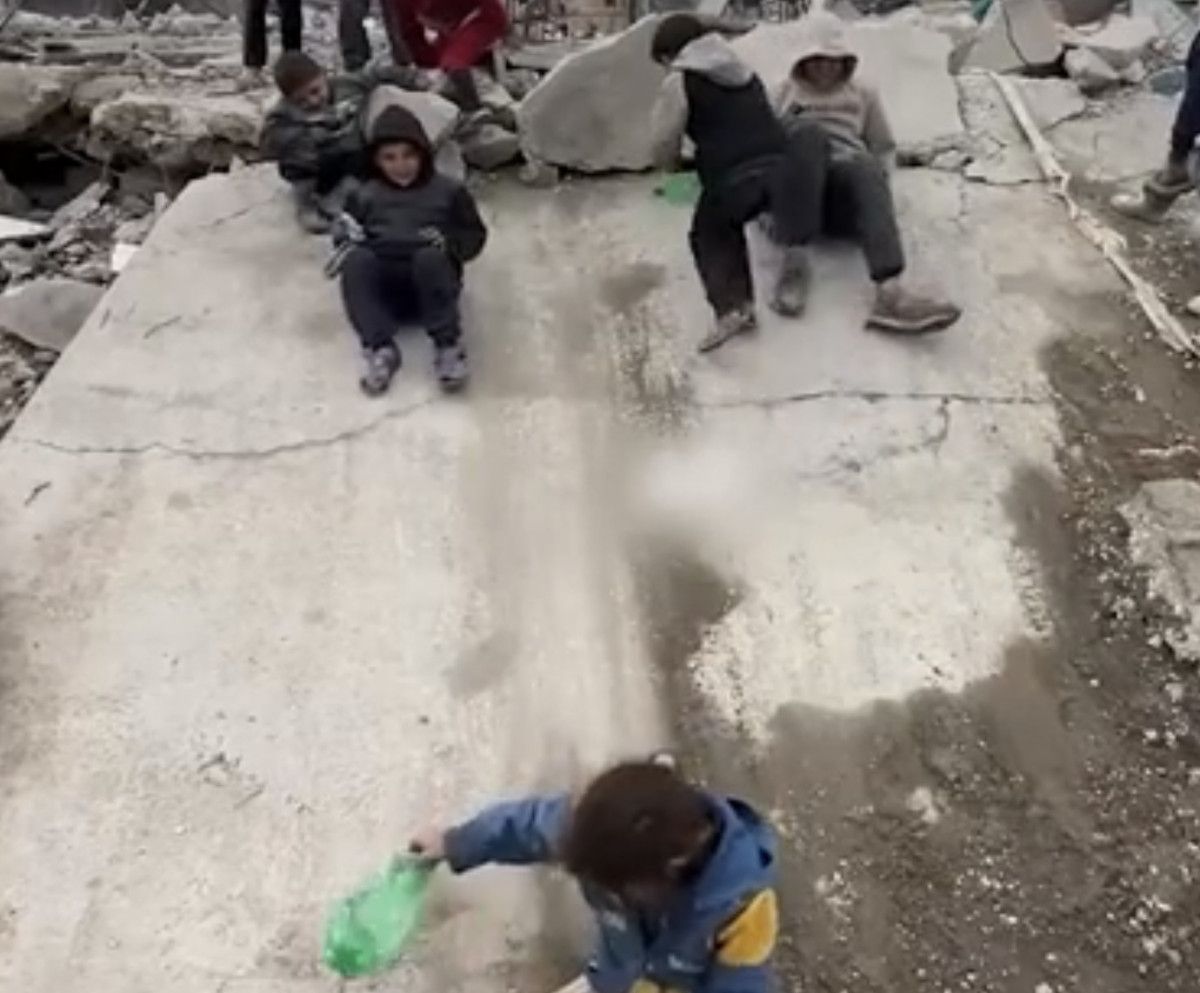 Çocuklar, yıkılan binaların demir parçalarından salıncak yaparak kendilerine savaşın ağır atmosferinden çıkacak bir eğlence alanı oluşturdu.