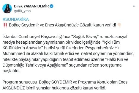 Program sunucusu Boğaç Soydemir ve programa konuk olan Enes Akgündüz isimli şahıslar hakkında gözaltı kararı verildi.